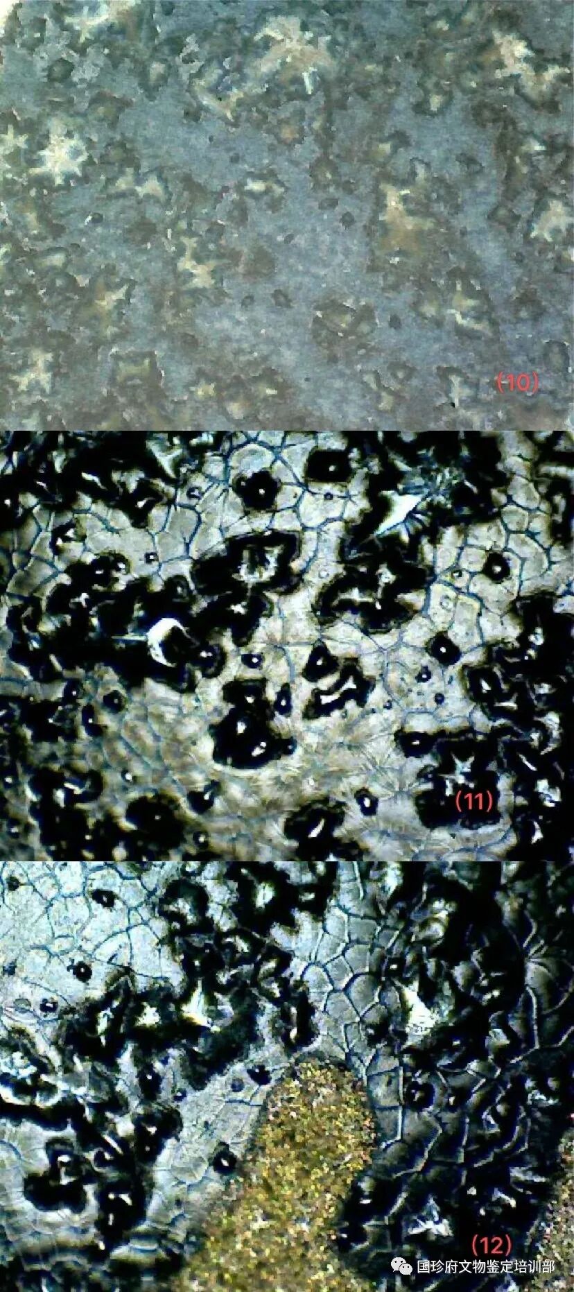 其次,在200倍显微镜下进行古陶瓷自然老化痕迹检测,检测结果,没有任何自然老化痕迹。却在釉面上检测到了明显的人为腐蚀做旧痕迹(见图片10、11、12)