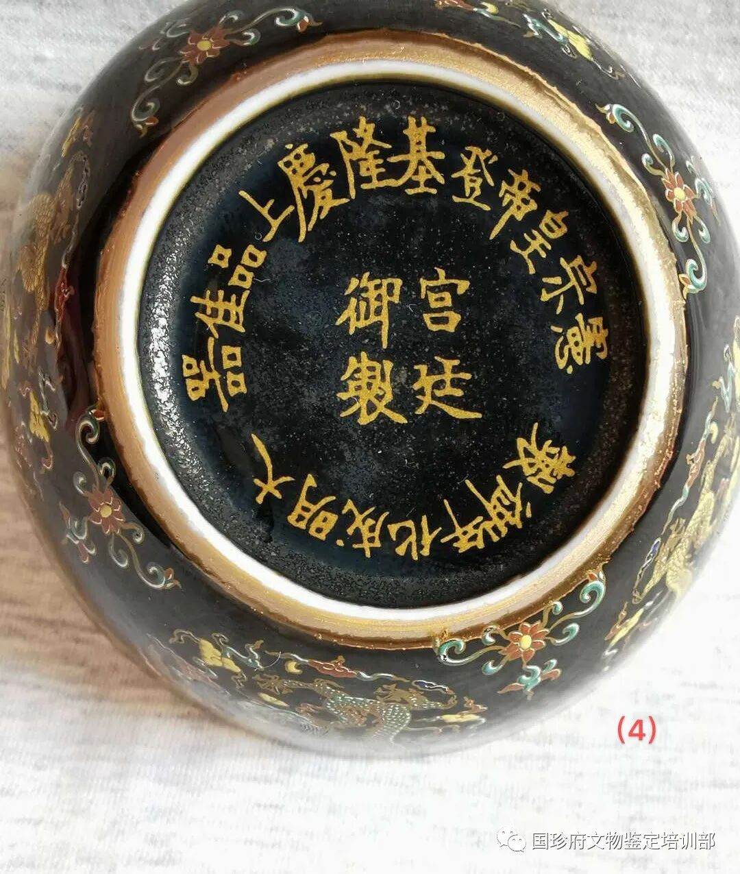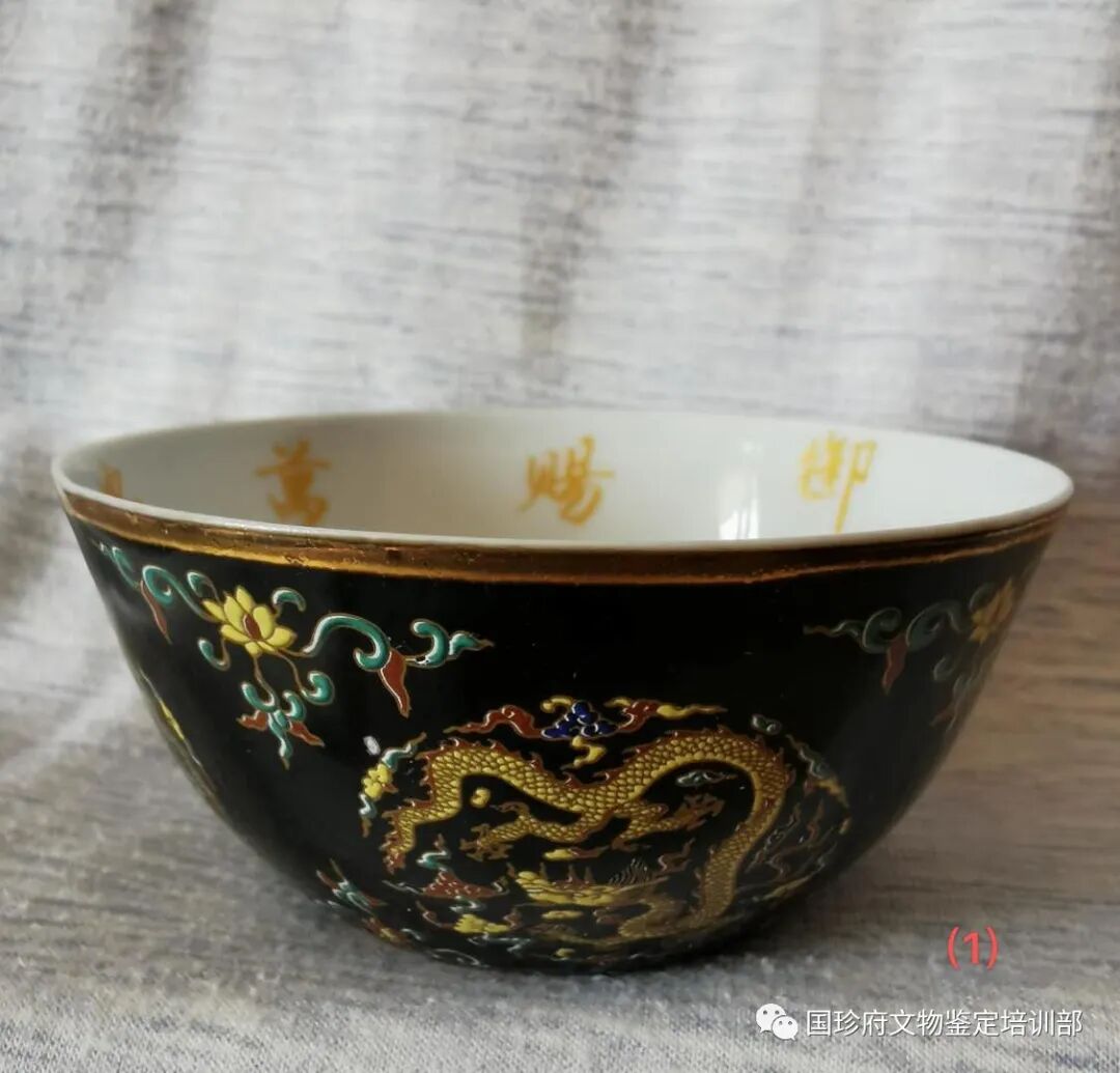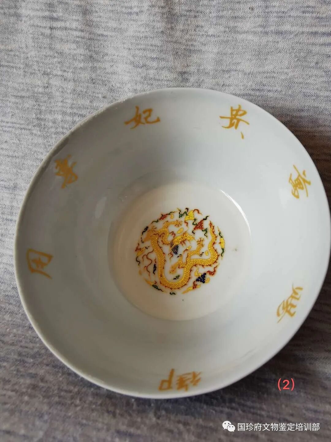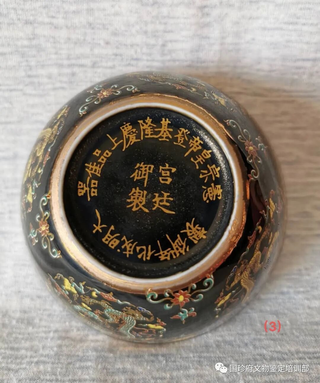 在这只成化御制团龙纹杯的底部,有如下的金彩铭文:“宪宗皇帝登基隆庆上品佳器”、“大明成化年御制”,底部中间还有“宫廷御制”四字。杯内书有金字“御赐万贵妃专用”。此杯精巧轻薄,纹饰精美。给人以高雅珍贵的感觉。虽然有人对它夸夸其谈,大赞不绝,而且有千万个理由加以肯定,但仍改变不了是现代仿品的事实。因为作伪者犯了一个常识性的错误。