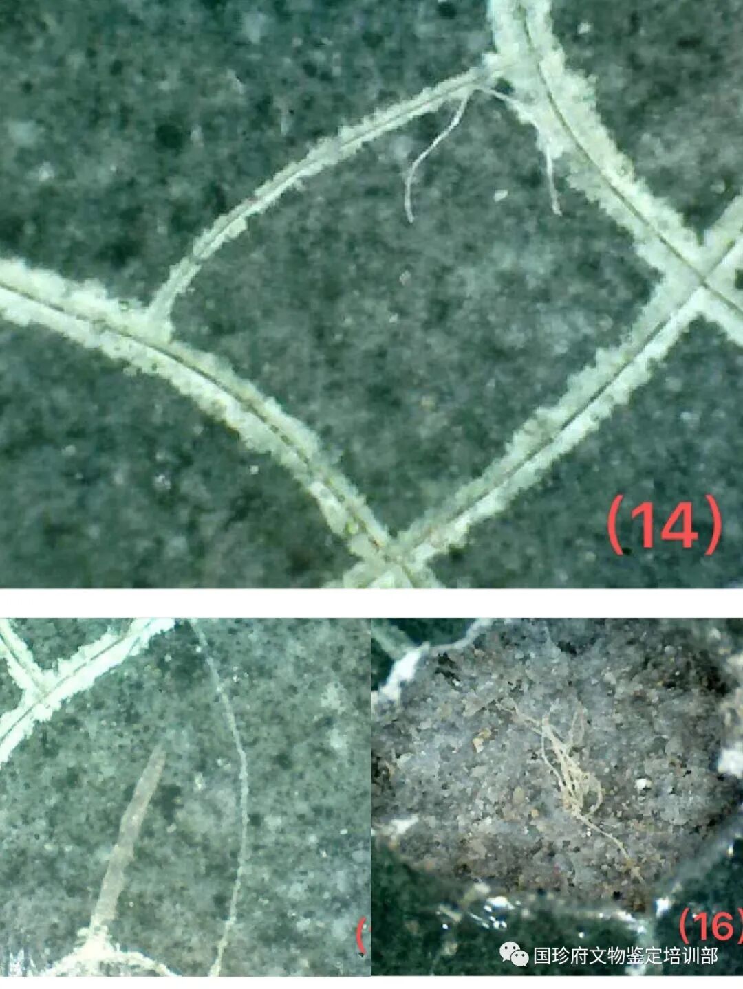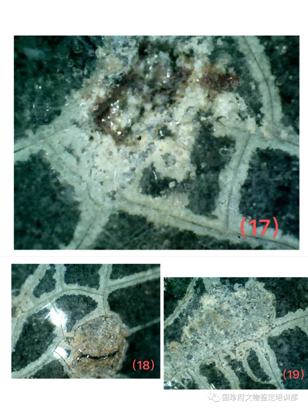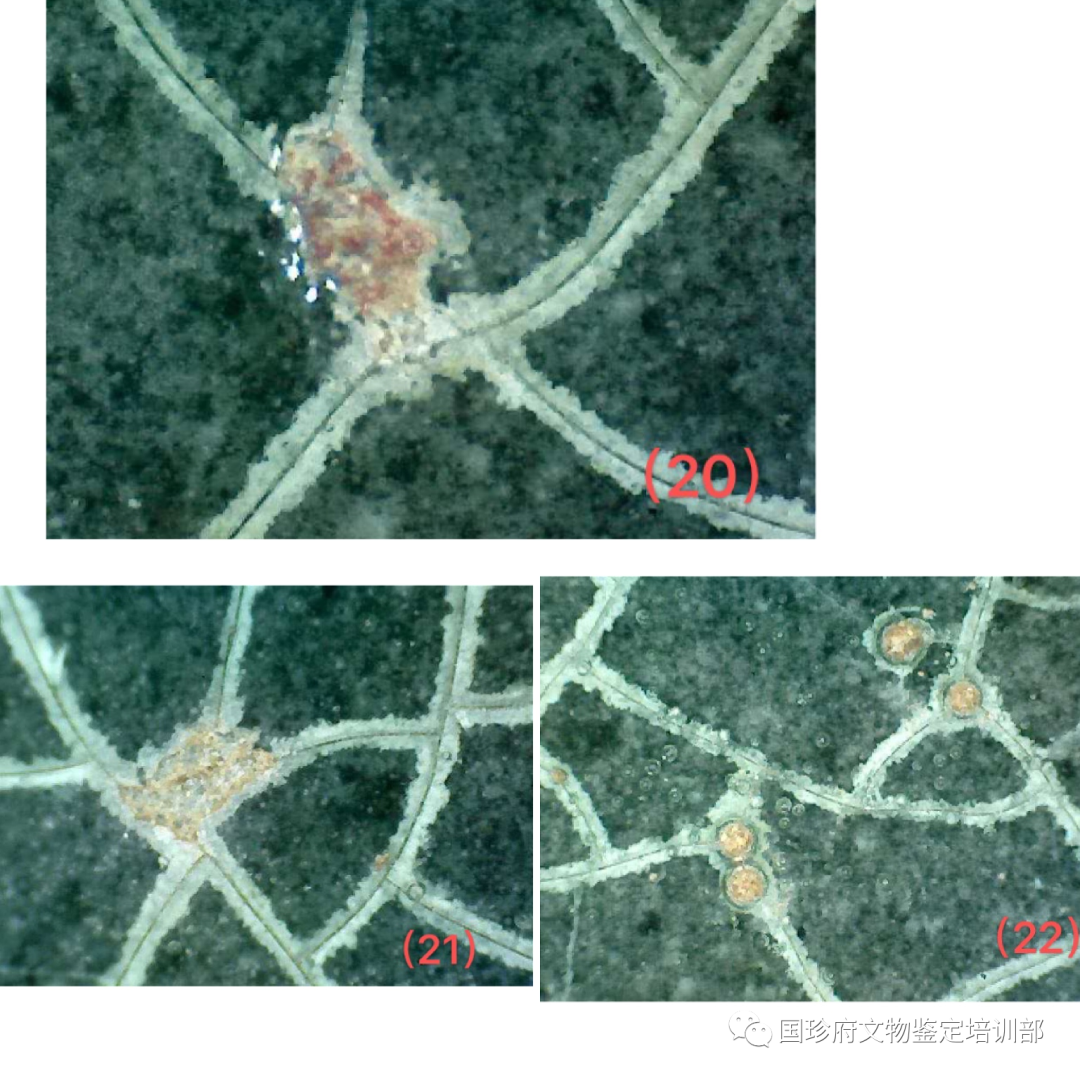 三、利用200倍显微镜检测老化痕迹,检测到腐蚀斑,釉面局部脱落,腐蚀线,破口气泡等自然老化痕迹。(见图片14、15、16、17、18、19、20、21、22)。