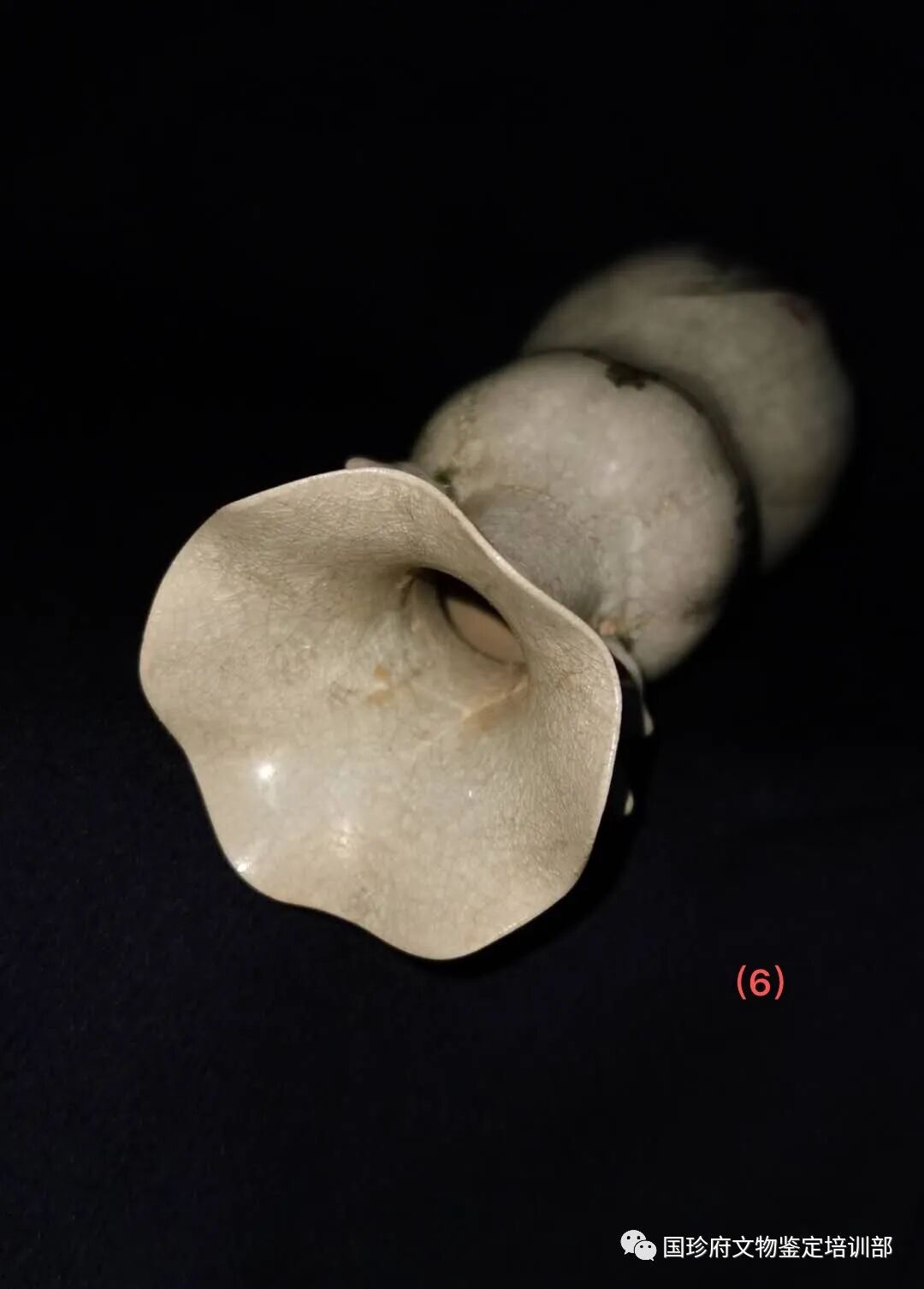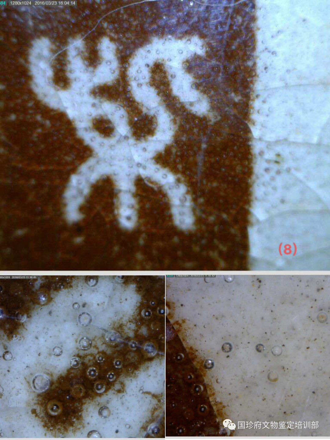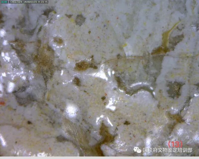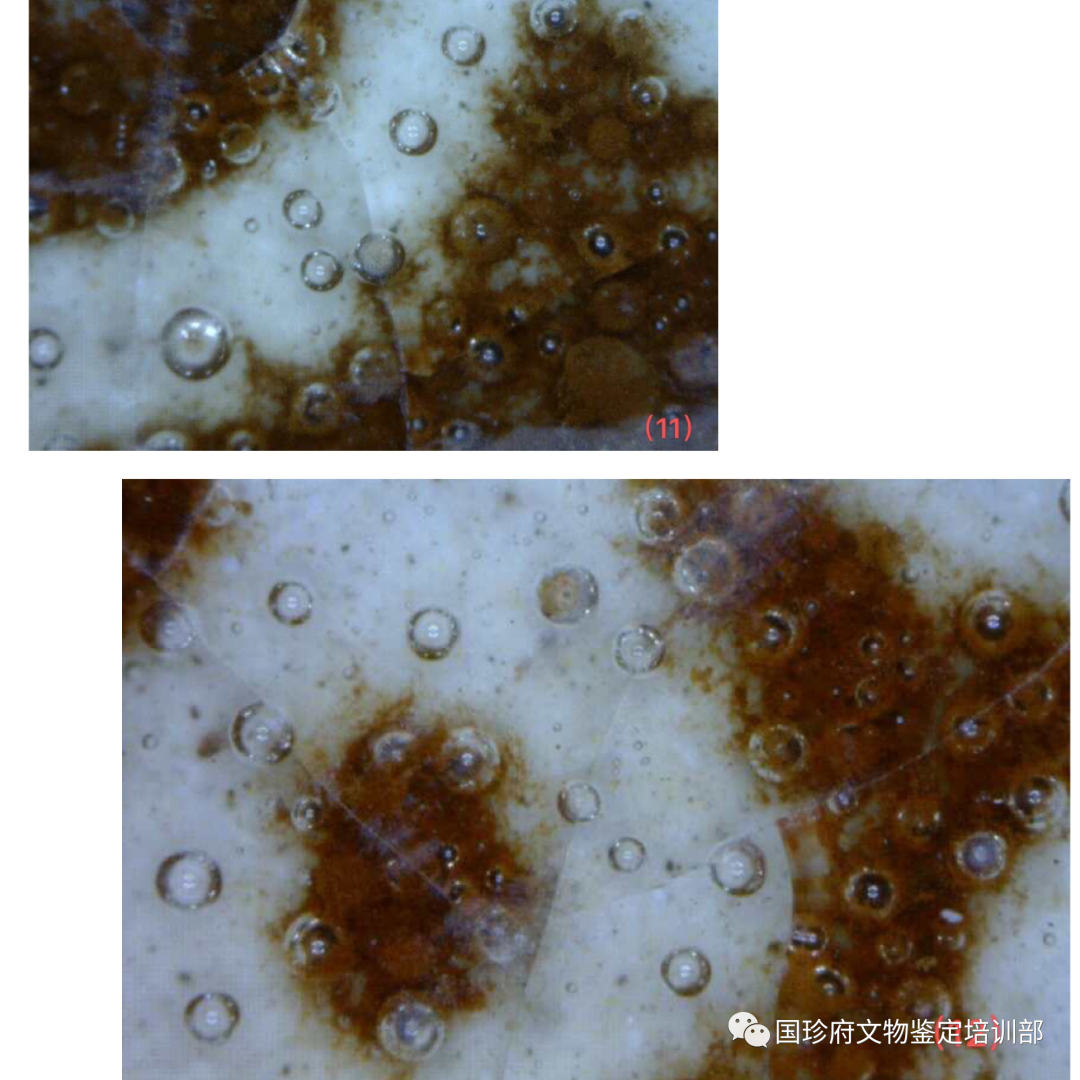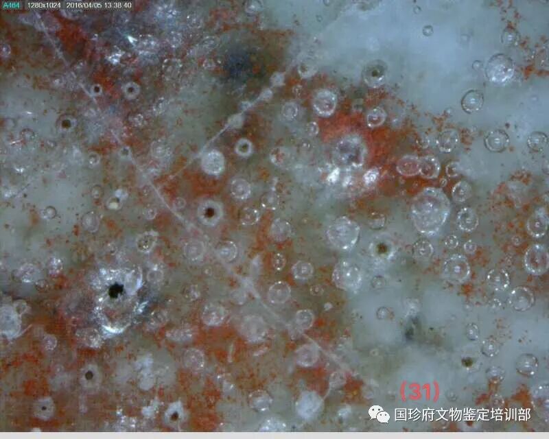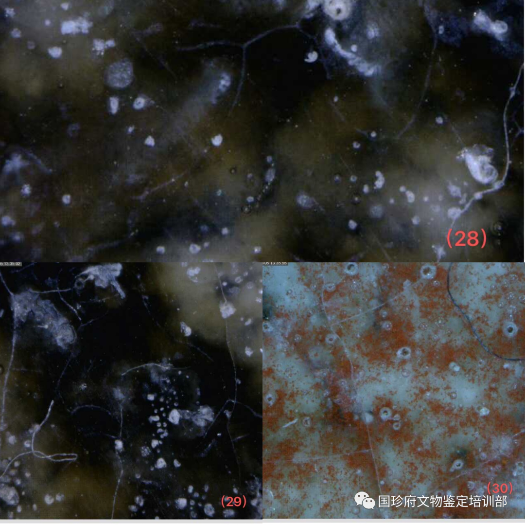 四句民谣很通俗,但它反映了事物的规律。老有老的特征,万物皆如此,古陶瓷也不列外。柴窑烧制于晚唐五代(951年—959年),柴荣皇帝当朝时期,距今已经1000年有余,不管它在地下埋藏(窖藏、遗址、墓葬、水下、窑址)还是传世,其釉面上必然会有老化痕迹,这种老化痕迹通过现代技术,是可以观察、测量、采集、标注、拍照、存储的。经公安部刑侦局原局长刘文挂帅,由中国刑事科学技术学会课题组研发并经公安部评审通过,古陶瓷釉面有十种自然老化痕迹。现在用200倍显微镜下检测,此葫芦瓶的釉下上有釉下白斑、变色气泡、破口气泡等多种自然老化痕迹,有的破口气泡内有沉积物质。有证据证明,没有人为主观做旧。其老化痕迹的形成属于自然形成。(见图片13、14、15、16、17、18、19、20、21、22、23