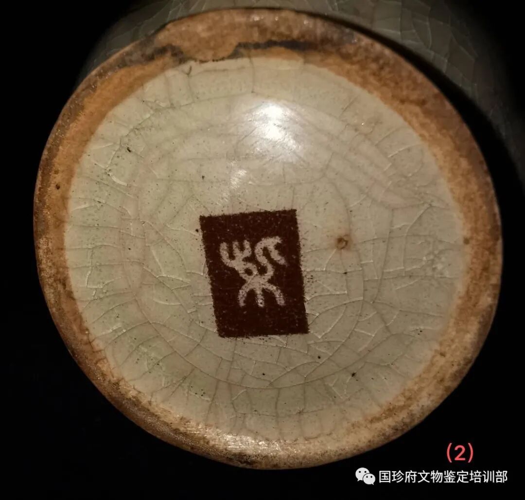 第二、此葫芦瓶的底足书有“柴“字篆书款,“柴”字篆书款在釉下,是和器身一起,一次性施釉烧制而成。“柴”字款上釉面老化痕迹依然明显。没有人为特殊处理痕迹。(见图片7、8、9、10、11、12、)