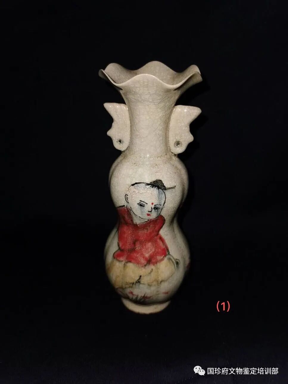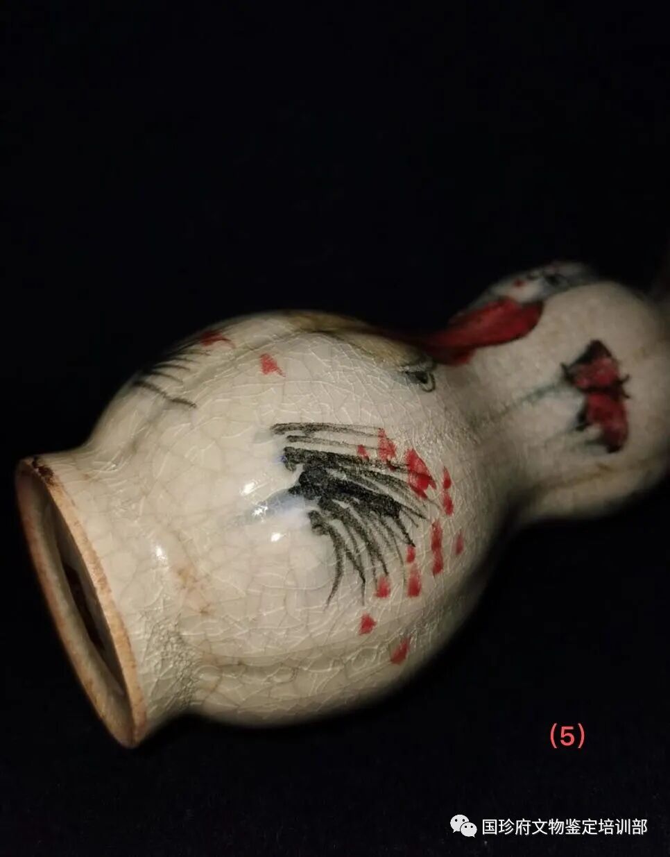 这是一件五代釉下彩婴戏纹葫芦瓶。用古书记载“青如天,明如镜、薄如纸、声如罄”12字来比对,似乎风马牛不相及。也可以说它不伦不类。但有证据证明,它确是五代柴窑釉下彩婴戏纹葫芦瓶,证据如下: