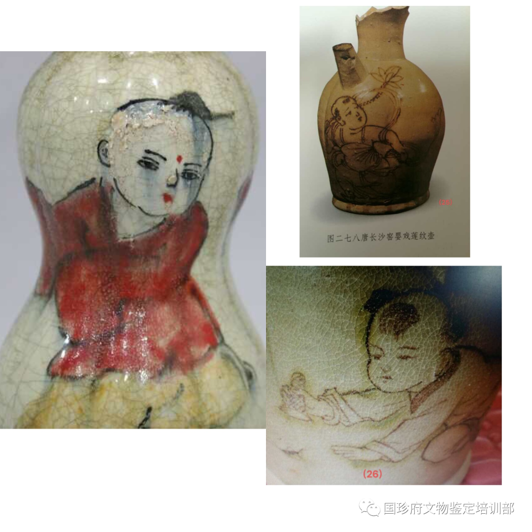 第三、此器物上绘有釉下彩婴戏纹。经与唐代长沙窑执壶上的婴戏纹进行比对,绘画技法及绘画风格相一致。相关资料证明婴戏纹出现在瓷器上,是始自唐代长沙窑。(见图片24、25、26)